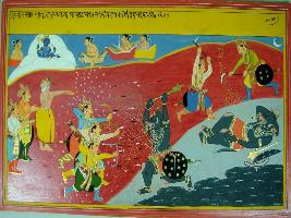 | Description / विवरण | Miniature painting based on Harivansha depicting battle between three kings and a demon, gods, sitting in vimans, are showering flowers from the sky. Lord Vishnu has been depicted in the top right corner. |