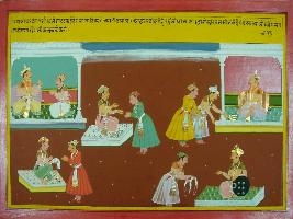 | Description / विवरण | Miniature painting based on Mahabharat - Sabha parva depicting Narad telling Yudhisthir about the Rajadharma, how to control the state and how to serve the peoples of the state. |