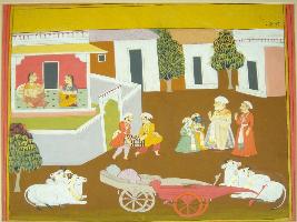 | Description / विवरण | Miniature painting based on Krishna charit depicting Krishna and Balram in the centre that talking with Nanda that followed by a man. While two bullock cart is seen in the lower part of the painting two ladies are seen in talking posture. |