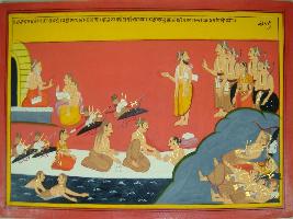 | Description / विवरण | Miniature painting based on Mahabharat - Vana parva. The painting depicts that Pandavas are taking bath in the river and after that they again begin to move with a sage. |