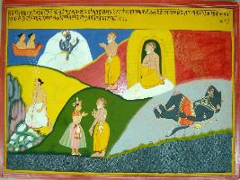 | Description / विवरण | Miniature painting based on Harivansha. On the upper part lord Vishnu is depicted with a sage and two heavenly figures, sitting on viman. In the lower part, the sage is talking to a king. In the left side a demon is sleeping on the ground. |
