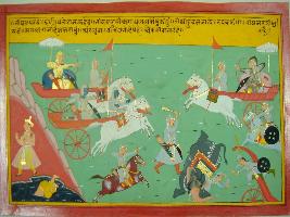 | Description / विवरण | Miniature painting based on Mahabharat - Bhishma parva depicting Sanjay narrating the war to Dhritrashtra and says that Bhim and Arjun together are fighting with Bhishma. |