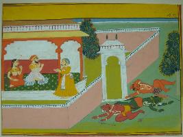 | Description / विवरण | Miniature painting based on Krishna charit depicting a couple sitting in the palatial balcony and talking with a person Probably Vasudev and Devki While three demons are seen outside the palace in sleeping position. |