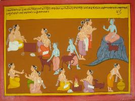 | Description / विवरण | Miniature painting based on Mahabharat - Vana parva. It depicts Devtas are worshipping Mahadev and offering him a goat. Mahadev accept the offering and left to heaven. |