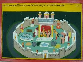 | Description / विवरण | Miniature painting based on Mahabharat - Sabha parva depicting Narad telling Yudhisthir the fort of a king should have all the basic necesities and it should be always filled with all arms and aminations. |