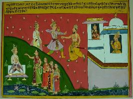 | Description / विवरण | Miniature painting based on Raghuvansha depicting fight between king Agni and Parasurama on the upper part right, next to them at the left side one female and a male are seen watching the fight from Palatial balcony. At the lower right side a king is depicted sitting on an asana and talking to four ladies. |