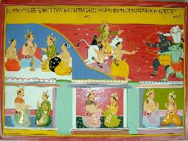 | Description / विवरण | Miniature painting based on Harivansha. This is a story based on king Manu, on the left side king is depicted talking with four men, on the right side he is depicted talking to three noble men. On the bottom four men are depicted walking and a man opening an animal trap. |
