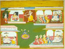 | Description / विवरण | Miniature painting based on Krishna charit. On the upper part Kamdev is depicting making aim by arrow to queen seated, and a king seated with three man on the lower part a king is depicted seating with a Brahman, and a king is depicting seated with four men Vishnu also is depicted here. |