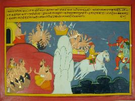 | Description / विवरण | Miniature painting based on Mahabharat - Vana parva depicting Pandavas coming to the ashram of Parasurama and asking Lomash sage where is Parasurama. The upper part depict Sahastrajuna is fighting with demons. |