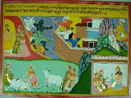 | Description / विवरण | Miniature painting based on Harivansha depicting demons attacking on Raja Rahivat s capital, in the absence of the king at the upper part of the painting. In the lower part, two kings walking with a cow and then killing it. |