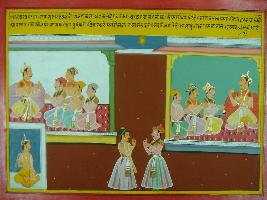| Description / विवरण | Miniature painting based on Mahabharat - Sabha parva. Narad is telling Yudhisthir that the king s mind should be in dharama, artha, kama and Moksha. And a king should always do goods deeds. |