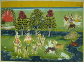 | Description / विवरण | Miniature painting based on Krishna charit depicting Krishna standing and playing flute at the middle of painting. To his right, Balram is shown standing and holding flute. Gopas are shown standing and holding a flute. Gopas are shown playing musical instrument and dancing in a circle. To their left, cows are depicted running. Above them and at the lower level, river Yamuna is shown. At the background forest is depicted. At the upper left, Brahma is shown with cows and Gopas. at the upper right, empty bower is depicted. |