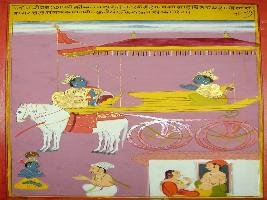 | Description / विवरण | Miniature painting based on Shri Bhagwat Gita. It depicts Krishna killing Arjun that the person who believes in him will attain moksha after death. |