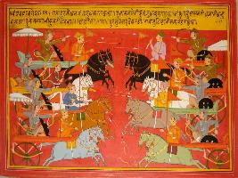 | Description / विवरण | Miniature painting based on Mahabharat - Bhishma parva depicting Duryodhan is fighting with Bhim, Dushashana is depicted fighting with Nakul and Nakul cut Durshasana s flag and bow then Dushasana cuts Nakul s flag. king Yudhisthir is depicted fighting with Shalya. |