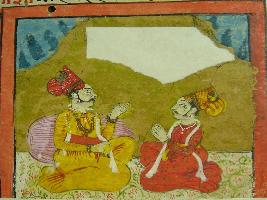 | Description / विवरण | Leaf from illustrated manuscript of Dhola Maru depicting Pingle sitting with a noble in his palace. Both of them are facing to each other. king is shown talking to him. This manuscript has 111 pages with 35 illustrations. |