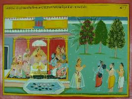 | Description / विवरण | Miniature painting based on Mahabharat - Sabha parva. The painting depits that when all persons left the court then Narad come to the palace of Yudhisthir and Yudhisthir is welcoming him. |