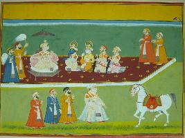 | Description / विवरण | Miniature painting based on Krishna charitra depicting Krishna and Balram followed by two nobles talking with the king Ugrasena the father of Kansa While in the lower part of the painting depicts that the kings followed by three nobles going. Somewhere and a horse is seen in front of them. |