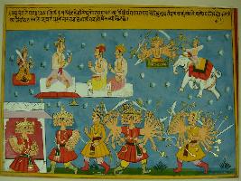 | Description / विवरण | Miniature painting based on Raghuvansha depicting at the upper left side fight between Indra and Ravan. In the lower part Ravan is fighting with another multi armed man. On the upper right side Apratip, the descendent of Kartivirya is sitting behind whom Goddess Lakshmi is depicted. |