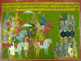 | Description / विवरण | Miniature painting based on Mahabharat - Bhishma parva. The painting depicts Bhishma and Yudhisthir on the eve of the war where Bhishma says that he is giving them the blessings for win. |