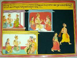 | Description / विवरण | Miniature painting based on Harivansha depicting Rishit sitting with his son. To their left king Sarja is sitting with his wife and son Aanrat and daughter Sukanya. At the lower left, Sukanya is shown leaving with a rishi. At the lower right king Aanrat is sitting with his sons. |