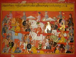 | Description / विवरण | Miniature painting based on Mahabharat - Bhishma parva depicting seven cavalry troops joining Yudhisthir and marched forward in the way they will turned the sea. |