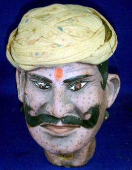 | Description / विवरण | Head of a man wearing cream coloured turban having moustaches. Black spots are seen on his face. The head is made of plaster of Paris. |