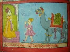 | Description / विवरण | Leaf from illustrated manuscript of Dhola Maru depicting Dhola standing outside his palace and asked for ornamented camel. Camel is shown bringing by a man. This manuscript has 11 pages with 35 illustrations. |