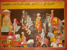 | Description / विवरण | Miniature painting based on Mahabharat - Bhishma parva depicting huge army of Pandavas, and a servant dressed up Yudhisthir for war. |