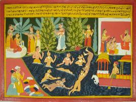 | Description / विवरण | Miniature painting based on Mahabharat - Vana parva depicting that Renuka has seen king Chitrarath playing with females in water. On the upper left fives sons of sage Jambdagni is depicted. |