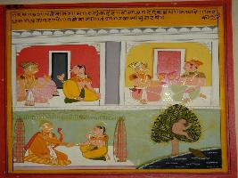 | Description / विवरण | Miniature painting based on Panchtantra, the upper left side one man is shown talking to a woman, on the right side two men are shown talking to each other. In the lower part a man shown talking to a woman holding her hand and a monkey sitting on a tree near the water body and a crocodile is in the water. |