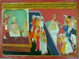 | Description / विवरण | Miniature painting based on Mahabharat - Sabha parva depicting sitting in court with ministe and other people. He is shown giving daan to needy person. |