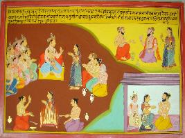 | Description / विवरण | Miniature painting based on Harivansha depicting two sages performing yagna and a woman named Ila appear s from the flames at the lower right part. At the top right, king Manu is Shown sitting in the middle and at his left, Ila is standing near by, three sages including Varun are sitting and to the right side of Manu, his eight son from Ila are sitting. He gives Ila to Varun, depicted in the lower left corner. Above them Ila is shown talking to two sages. |