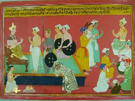 | Description / विवरण | Miniature painting based on Mahabharat - Sabha parva depicting messengers are shown coming to court to king at the right part. At the left part, men are depicted talking. Brahman is pefroming yagna. |