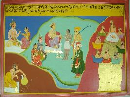 | Description / विवरण | Miniature painting based on Harivansha depicting a king on throne giving judgement to a culprit. In the right side a king is talking to a woman, below them a sage is sitting with an axe. In the left part, a sage is meditating on a hill top and surrounded by Sapta rishis, seated on vimans. |