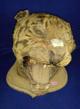 | Description / विवरण | Head of a tiger which was hunted by the king of Jaipur. The tiger has open mouth with teeth. It is preserved with taxidermy system. |