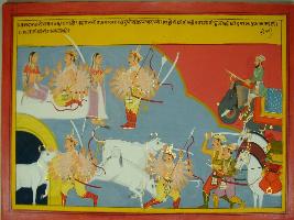 | Description / विवरण | Miniature painting based on Mahabharat - Vana parva depicting with ten pair of hand coming to Brihgu rishis ashram and tried to take his cow. His cow is shown attacking him at lower panel. |