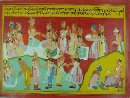 | Description / विवरण | Miniature painting based on Mahabharat - Sabha parva depicting many king coming to meet king Yudhisthir form participainting in yagna. Bhishma, Dronacharya and Kripa charya came to Indraprastha for yagna. king is welcoming Brahman includding Asva thama. |