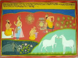 | Description / विवरण | Miniature painting based on Harivansha depicting a sage talking with king and in the next scene sage is busy to making some thing, in the below part elephant having bath and couple of horse is making love. It is incomplete painting. |