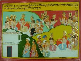| Description / विवरण | Miniature painting based on Mahabharat - Sabha parva depicting Dhritrashtra coming to Indraprastha to participate in Yagana with Bhishma, Vidur sons and women Yudhisthir is shown welcoming, meeting and talking to Kauravas. |