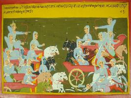 | Description / विवरण | Miniature painting based on Mahabharat - Shalya parva depicting fighting scene between Pandavas and warriors from Kaurva army. Sehdev came in front of Sakuni for a fight. Bhim told Sakuni that he had manipulate Duryodhan. Sakuni got killed by Sehdeva. |