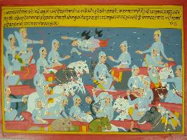 | Description / विवरण | Miniature painting based on Mahabharat - Shalya parva depicting fighting scene between Pandavas and Kaurvas Bhiman as fighting with Uluk. Sender came in between and cut Uluk s head adn bows of Sakuni. The Sakuni took sword, their mace, and the Barchi. All are cut by Sehdeva. |