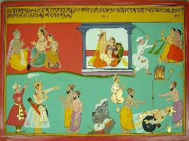 | Description / विवरण | Miniature painting based on Harivansha depicting a rishi talking to a king and a queen, in middle upper part a king and queen are shown in loving union, while his man is beating two Brahmans. In the lower part, the king is talking to two sages and in the opposite side, he is lying dead and the two sages churning his body. |