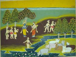 | Description / विवरण | Miniature painting based on Krishna charit depicting Krishna talking to Narad Muni who is carrying veena in his hand at middle of painting. Gopas are shown surrounding them. At the background, forest is being depicted with river Yamuna at the lower and middle part of painting. At the lower part, cows are depicted sitting and one of them drinking water. |