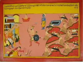 | Description / विवरण | Miniature painting based on Mahabharat - Vana parva depicting Parasurama after killing the son of Sahastrajuna performing the funeral of his father. |