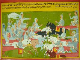 | Description / विवरण | Miniature painting based on Mahabharat - Shalya parva depicting Pandavas fighting with Kaurva. Krishna is shown talking to Arjun. |