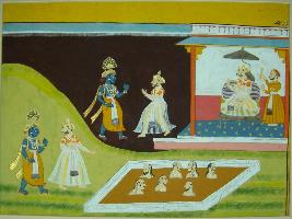 | Description / विवरण | Miniature painting based on Krishna charitra. It is depiction of Krishna with Kansa and also some men depicted taking bath in a pond. |