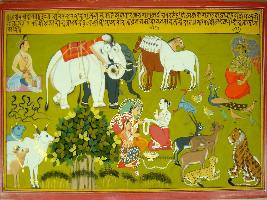 | Description / विवरण | Miniature painting based on Harivansha depicting Vasu seated in the right upper part. In the centre, two apsaras are sitting with a rishi. The painting depicts that Airavat is the king of elephants, a seven headed horse is the king of horses, Garuda of all the birds, Vasuki of the snakes, Kamdhenu among the cows, Banyan tree among the trees, and tiger of the animals. |