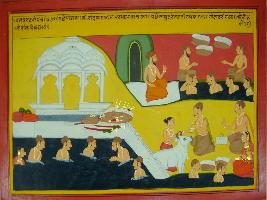 | Description / विवरण | Miniature painting based on Mahabharat - Vana parva depicting Pandavas taking bath in the sea. After that they are going to the bank of Godavari and gifting many bows as daan. |