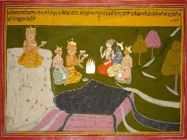 | Description / विवरण | Miniature painting based on Mahabharat - Bhishma parva. The painting depicts that in the begining Ganga was in Brahma loka and Brahma. Bhagirath, Indra and Shiv is doing yagna for Ganga to take on earth. |