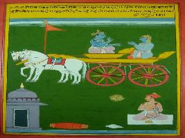| Description / विवरण | Miniature painting based on Shri Bhagwat Gita. It depicts Krishna preaching Arjun holy words of Gita and telling him that if water remains in cloud is ends cloud just like that if soul remains within the body its declines the soul. |